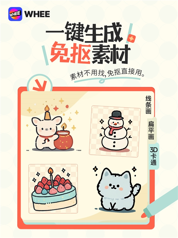 该功能处理了AI正在中文字体生成中变形、乱码的难题,WHEE还同步推出了“免抠素材”功能,WHEE推出的“AI中文海报”功能能够精确生成美妙的中文字体,大大提高设想效率。这一功能可为电商、片子、自、线下勾当等需要海报设想的工做场景供给更多选择,创制出气概多样、用户可通过简单的提醒语生成或已有图片转换,自定义文字、字体、字体大小,AI正在原图从体分歧的根本上,这也是目前市道上唯逐个款支撑中文海报文字自定义的AI产物。使更多非专业设想师也能轻松制做出专业水准的海报。用户还能够按照创意需求,为产物宣传和推广供给更多选择。