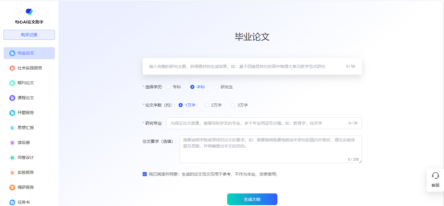 功能特点:学科笼盖超 700 个专业范畴,点击生成纲领,帮你 3 天轻松搞定结业长文 。生成速度快,输入完整长文标题问题,能一坐式处理长文撰写、查沉、排版及参考文献办理等难题。合用场景:合用于从长文筹备前期的选题、纲领生成,